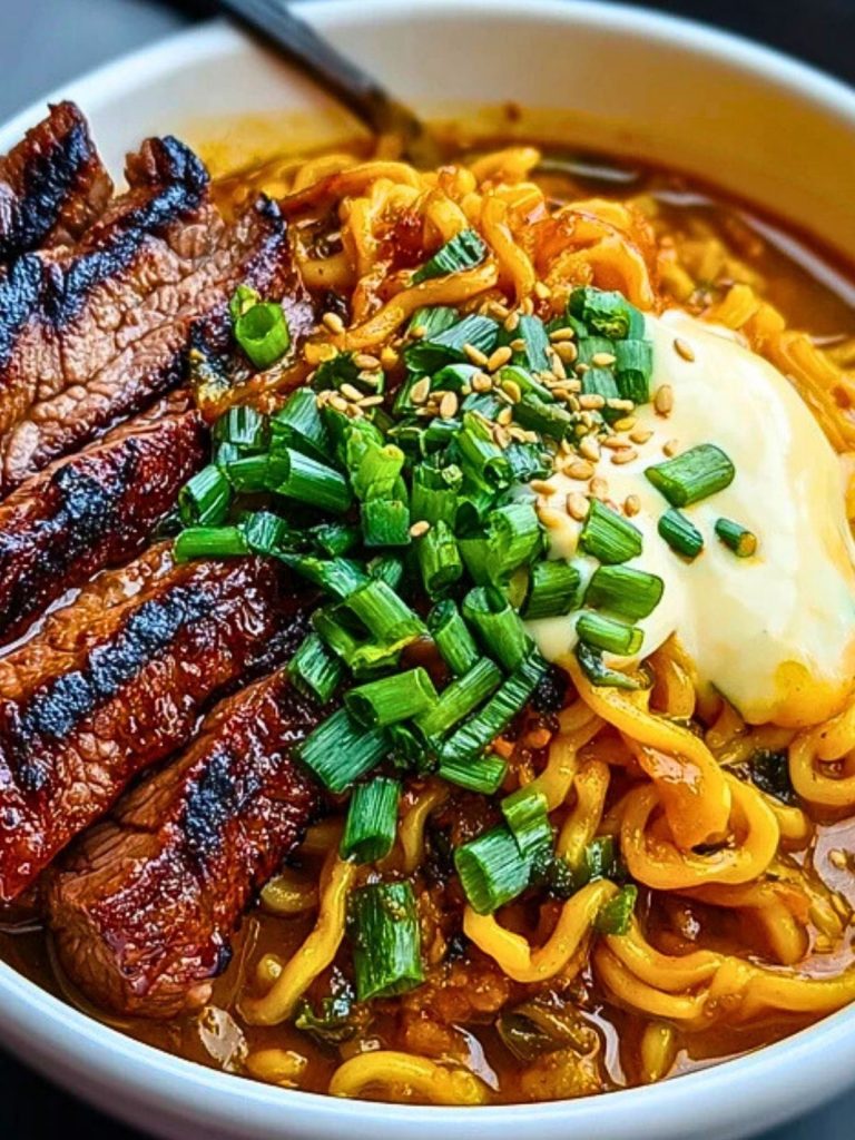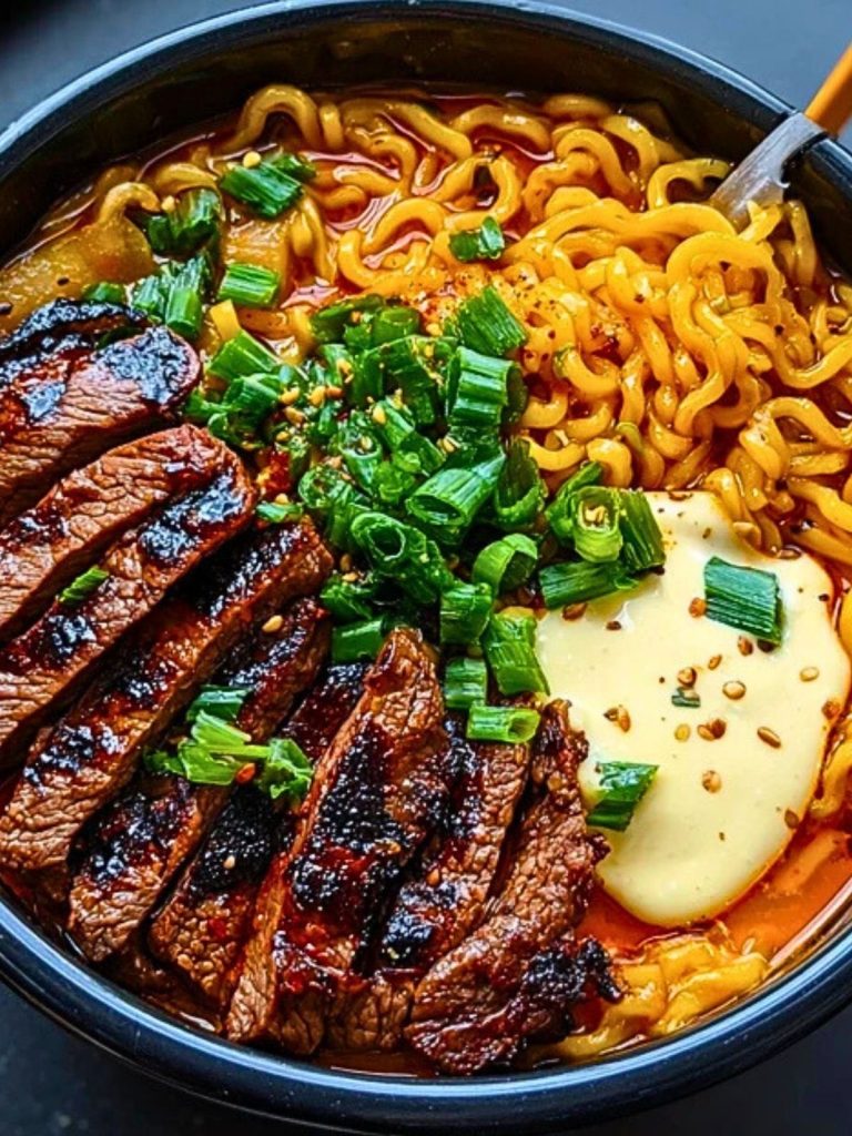 When spicy comfort meets steakhouse-style indulgence, you get this bold and unforgettable Spicy Korean Ramen with Grilled Beef & Creamy Sauce. Perfectly seared, savory beef slices layered on a bed of chewy, chili-spiked ramen noodles, all crowned with a silky dollop of creamy mayo-based sauce and garnished with vibrant scallions and sautéed vegetables—this dish isn’t just dinner; it’s an experience.