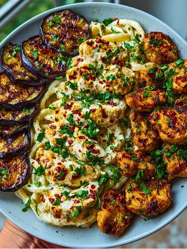 Creamy, spicy, and absolutely unforgettable—this pasta dish is everything you want on a cozy night in or when you’re looking to impress someone with bold flavor. The whipped feta Alfredo sauce is velvety and tangy, marrying perfectly with juicy, pan-seared chicken chunks that have been kissed by spice. Add in crispy roasted eggplant rounds with a hint of char, and a bold chili oil drizzle that brings it all together, and you’ve got a meal worth repeating.
