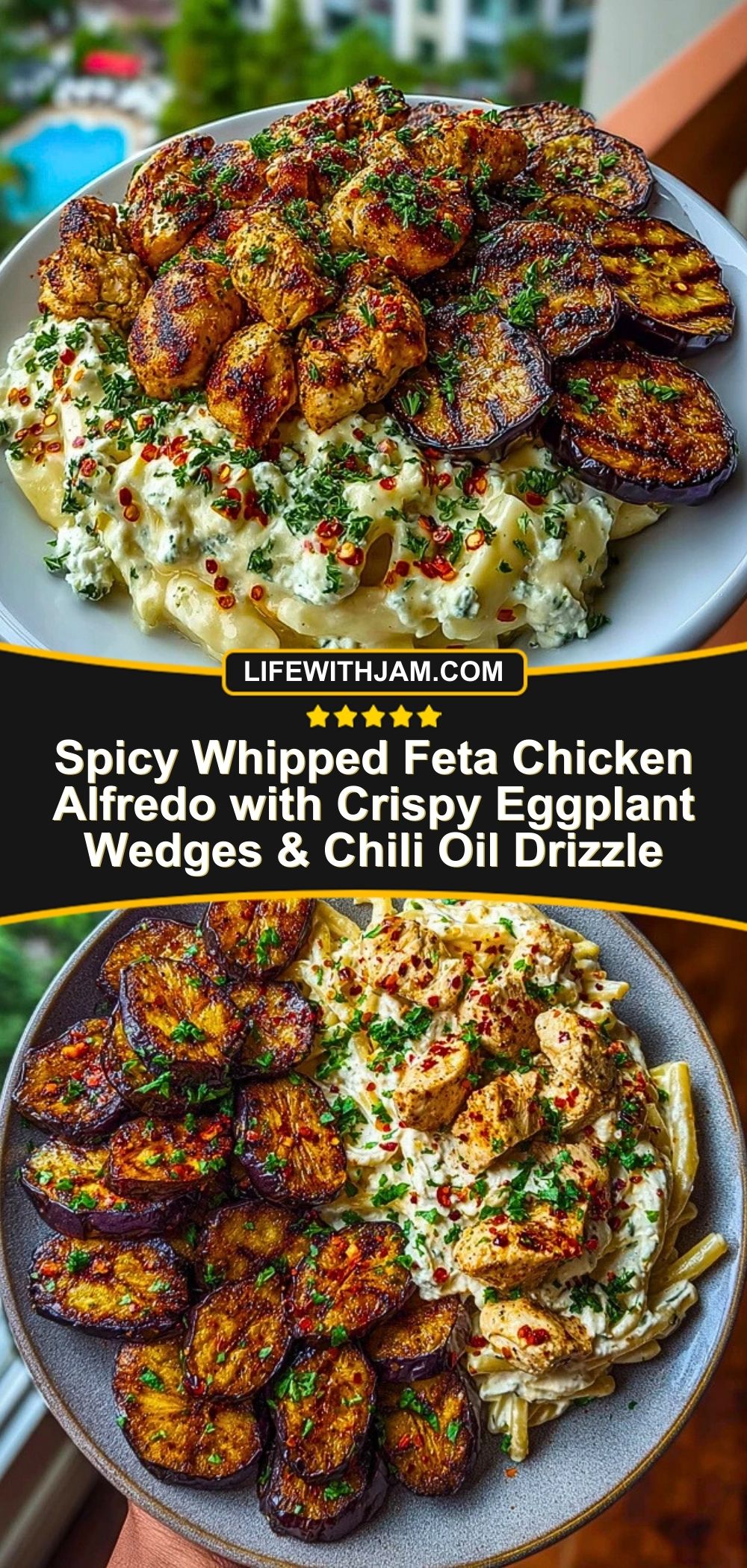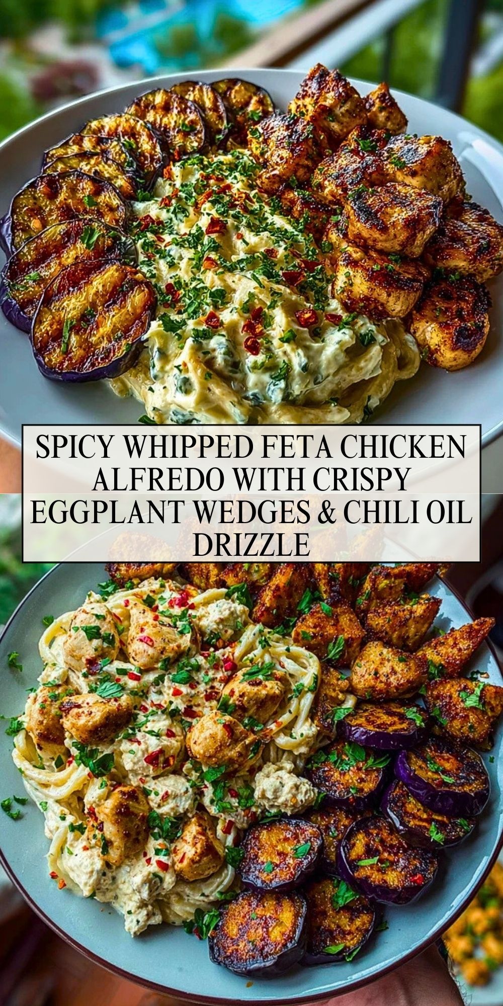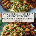 Spicy Whipped Feta Chicken Alfredo with Crispy Eggplant Wedges & Chili Oil Drizzle