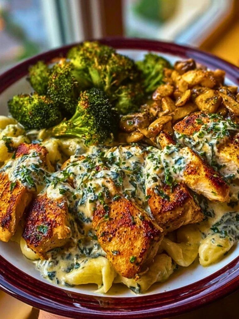 A creamy, indulgent pasta dinner featuring Greek-seasoned chicken, roasted Parmesan broccoli, and a velvety mushroom basil cream sauce with spinach and artichokes. Perfect for a restaurant-quality meal at home.
