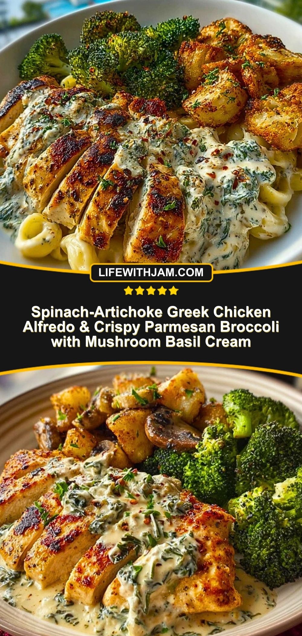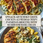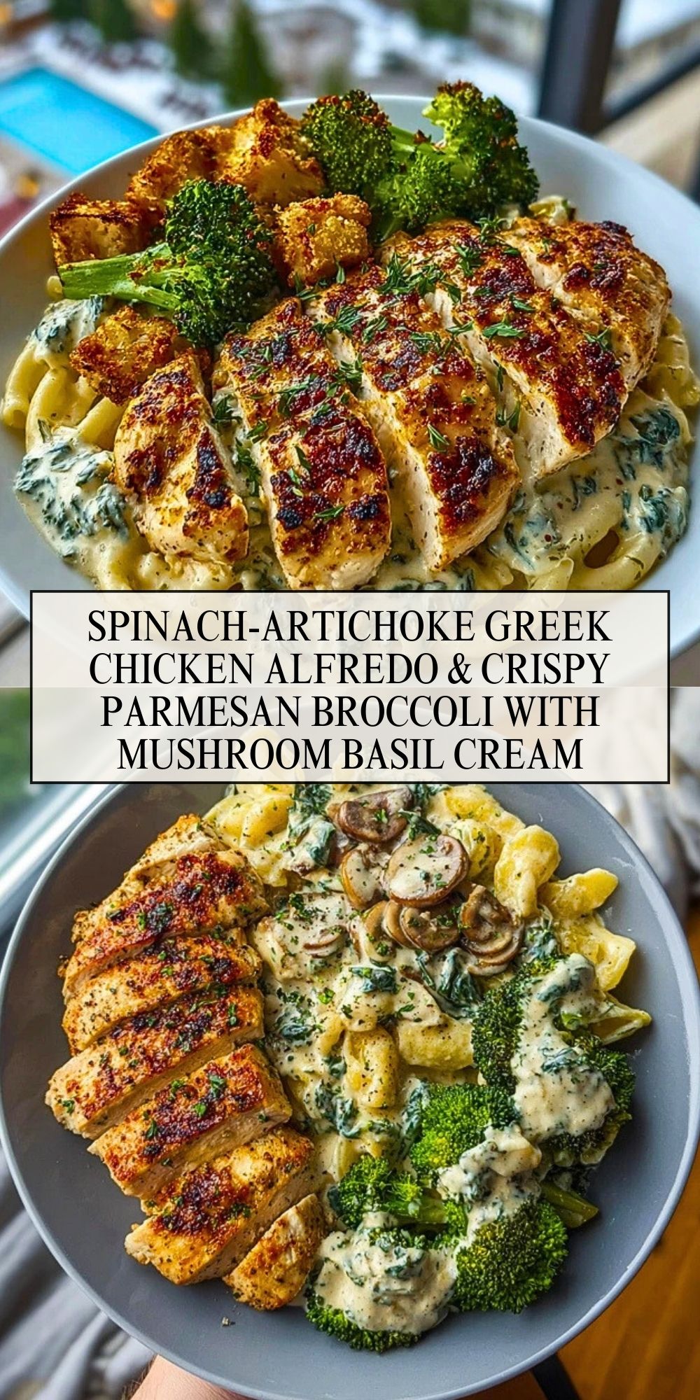 Spinach-Artichoke Greek Chicken Alfredo & Crispy Parmesan Broccoli with Mushroom Basil Cream