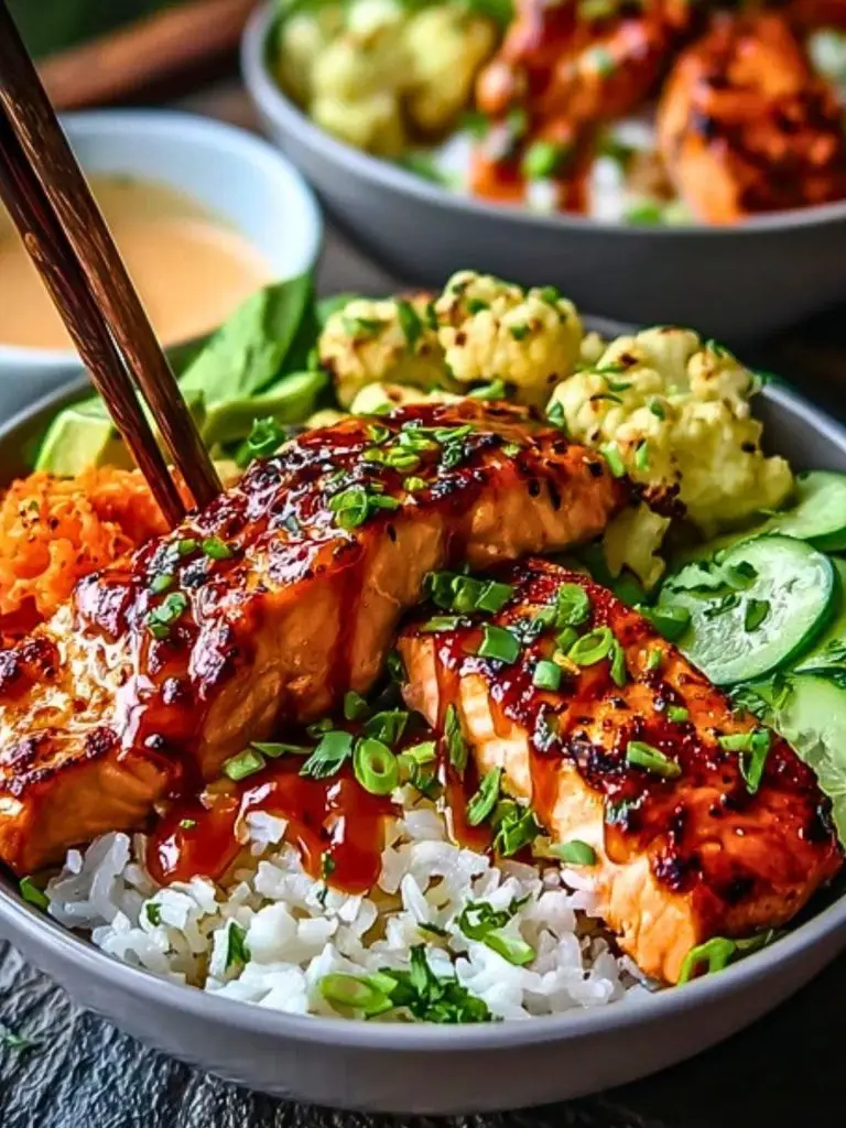 These Sriracha Honey Salmon Bowls are a bold, balanced fusion of sweet, spicy, and savory. Glazed salmon bites caramelize in a sticky honey-sriracha sauce and are served over fluffy white rice with golden roasted cauliflower. Quick to make and full of flavor, this meal is perfect for weeknights, meal prep, or impressing guests with minimal effort.