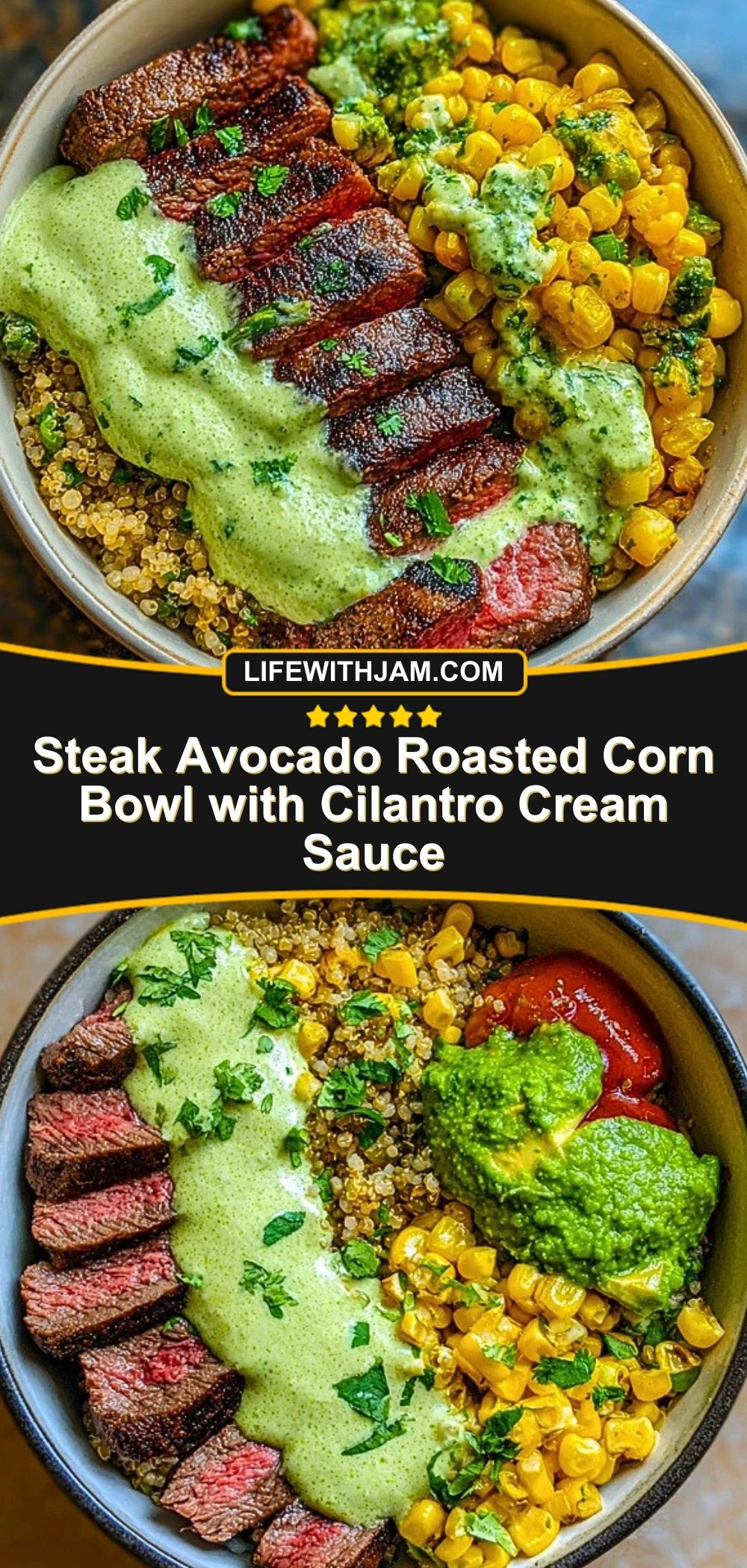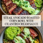 Steak Avocado Roasted Corn Bowl with Cilantro Cream Sauce