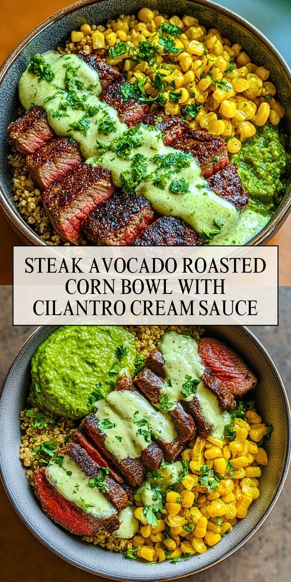 Layer cooked quinoa at the bottom of each bowl. Top with slices of steak, roasted corn, diced avocado, and a generous drizzle of cilantro cream sauce. Garnish with extra cilantro or a squeeze of lime if desired.