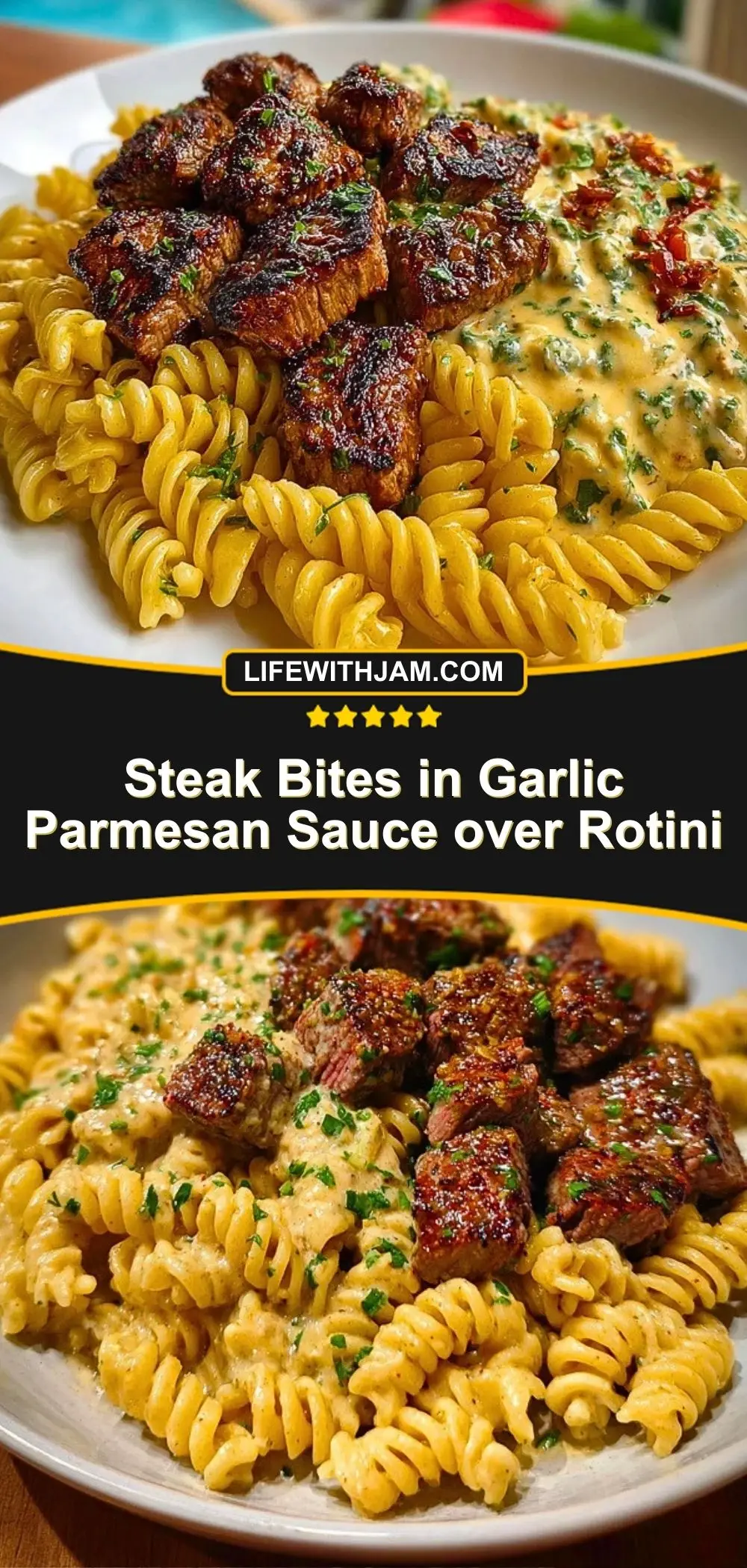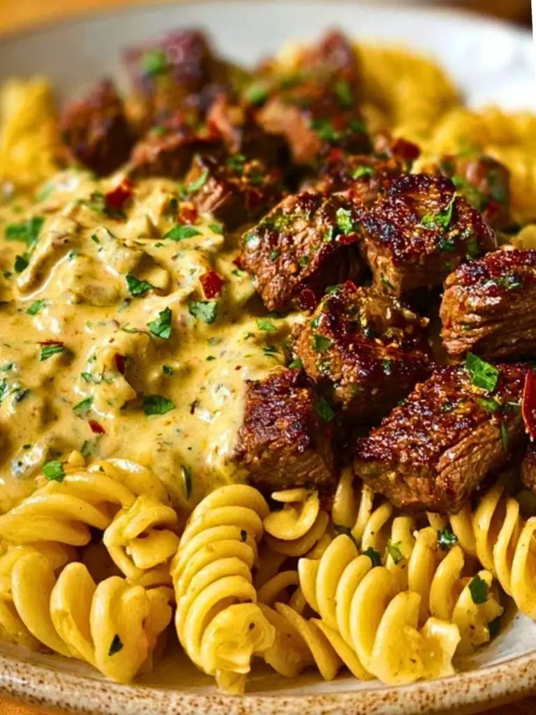 Juicy seared steak bites smothered in a creamy garlic parmesan sauce, served over rotini pasta. This indulgent dinner is perfect for date night or whenever you want a restaurant-quality meal with minimal effort.