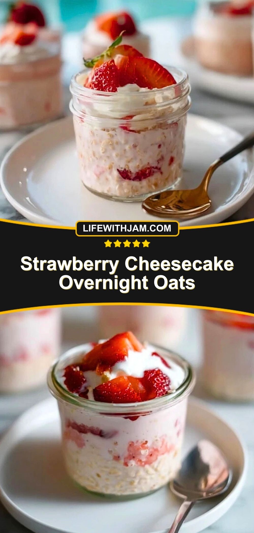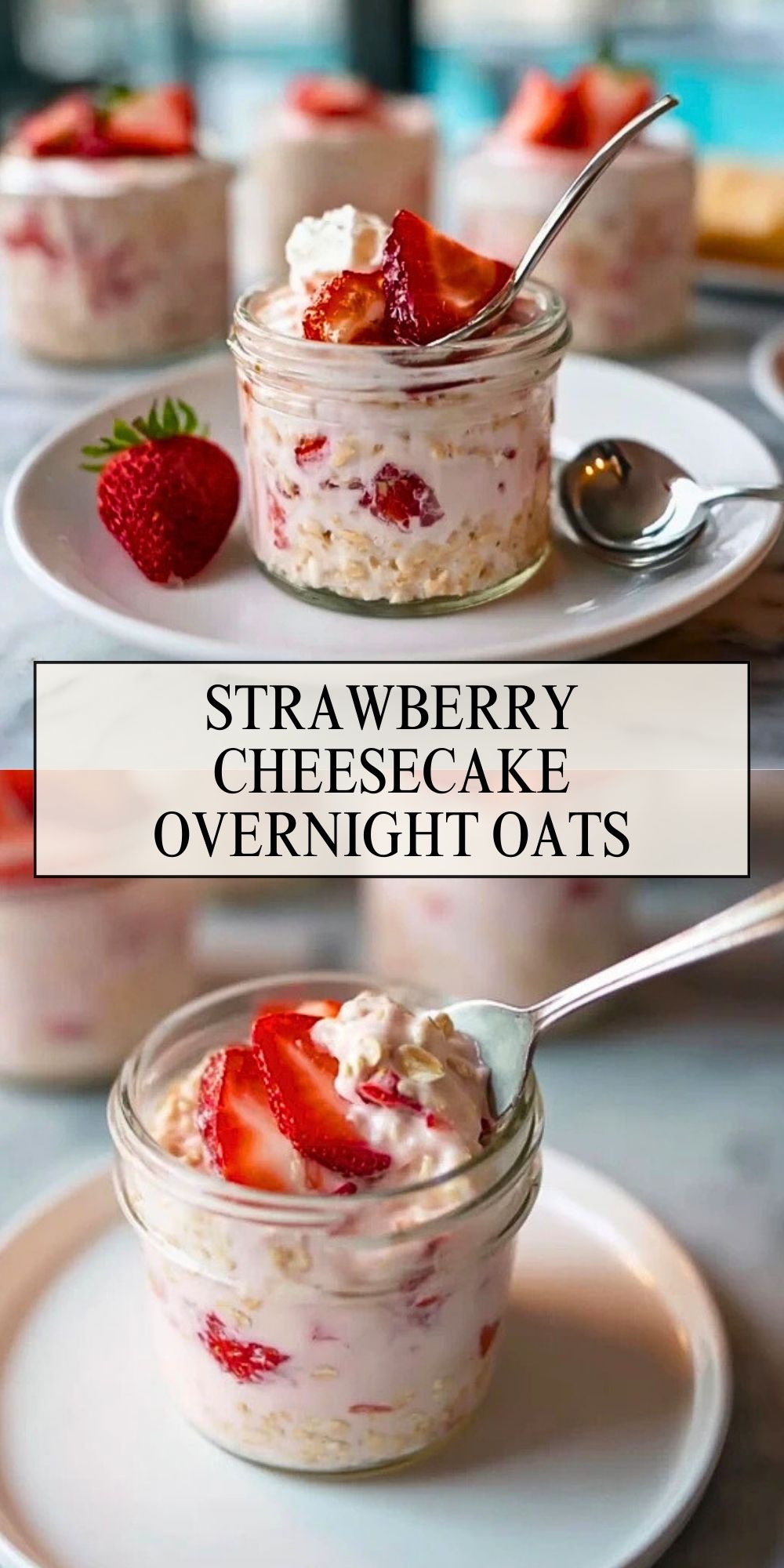These overnight oats are best served chilled, straight from the fridge. They make a dreamy grab-and-go breakfast, snack, or even a lighter dessert. To elevate them just before serving, add a swirl of whipped cream or extra Greek yogurt on top, followed by sliced strawberries and a crumble of graham crackers. That final layer adds the perfect cheesecake “crust” texture.