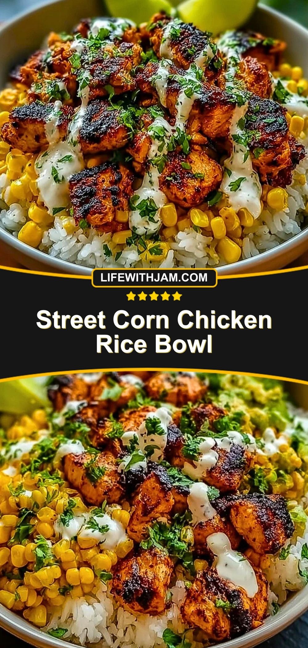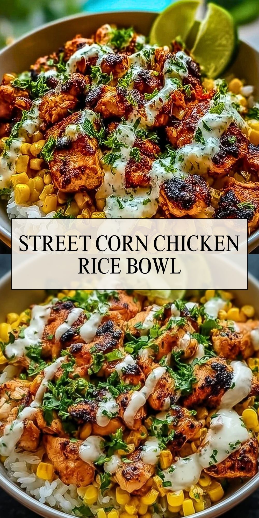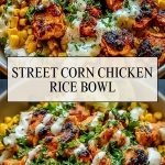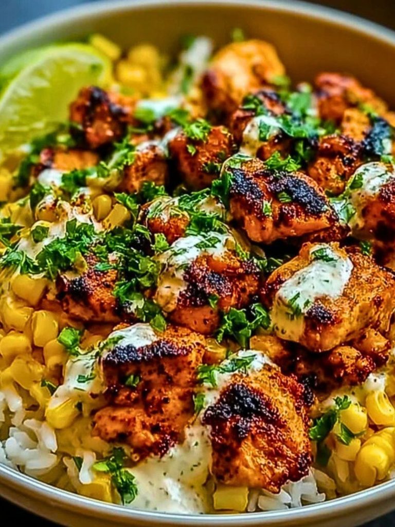 A vibrant and flavorful Street Corn Chicken Rice Bowl inspired by Mexican elote. This easy meal features juicy grilled chicken, charred sweet corn, fluffy rice, and a zesty cilantro-lime sauce for the perfect balance of savory, creamy, and fresh.