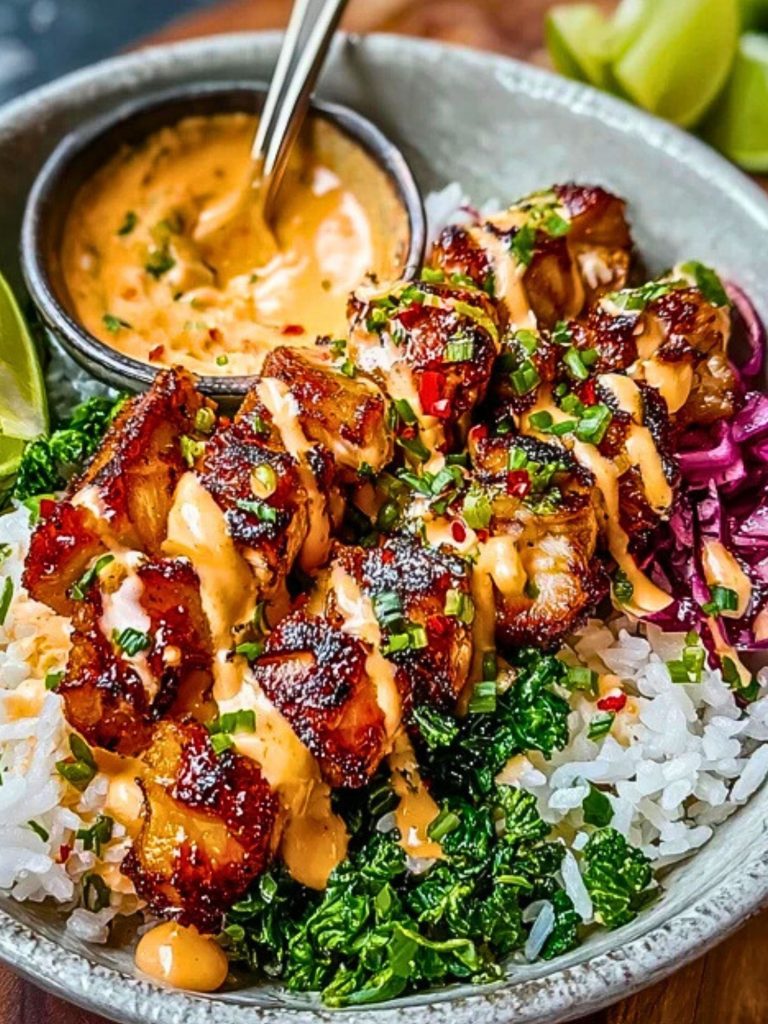 A perfect blend of bold, creamy, spicy, and tangy—this Sweet Chili Chicken Bowl with Coconut Lime Drizzle is an absolute flavor bomb. Grilled to smoky perfection, the tender chicken gets its heat and sweetness from a sticky sweet chili glaze, balanced by the cool, citrusy richness of a coconut-lime drizzle. Served over fluffy jasmine rice with a splash of fresh lime juice, it’s the kind of meal that satisfies all your cravings in one bite.