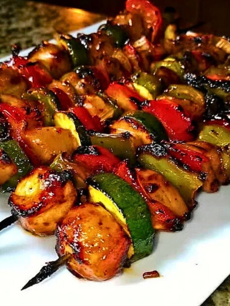 As for veggies, think color and texture. Bell peppers (red, yellow, and green), zucchini, mushrooms, red onion, and cherry tomatoes all grill beautifully and add natural sweetness to balance the glaze.
