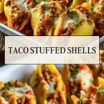 These Taco Stuffed Shells are a comforting mashup of two favorite cuisines—Italian and Mexican. Jumbo pasta shells are stuffed with seasoned taco beef, layered with salsa, and smothered in gooey cheese for the ultimate baked dinner. Perfect for weeknights, meal prep, or feeding a crowd!