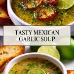 Serve Tasty Mexican Garlic Soup piping hot with a wedge of lime and a sprinkle of fresh cilantro on top. It’s excellent as a starter, or add extra bread and egg for a heartier main dish. A piece of buttery toast or tortilla chips on the side takes it to the next level.