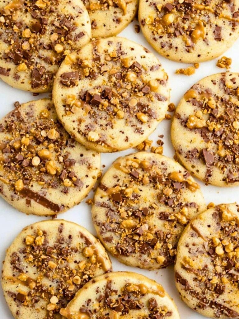 The beauty of this cookie is in the simplicity—once the dough is made, it chills into a log you can slice and bake on demand. Packed with toffee bits and chocolate shavings, these cookies bring the best of candy bar flavor into a soft, buttery dough. A quick drizzle of caramel on top (optional but highly recommended!) takes them over the top.