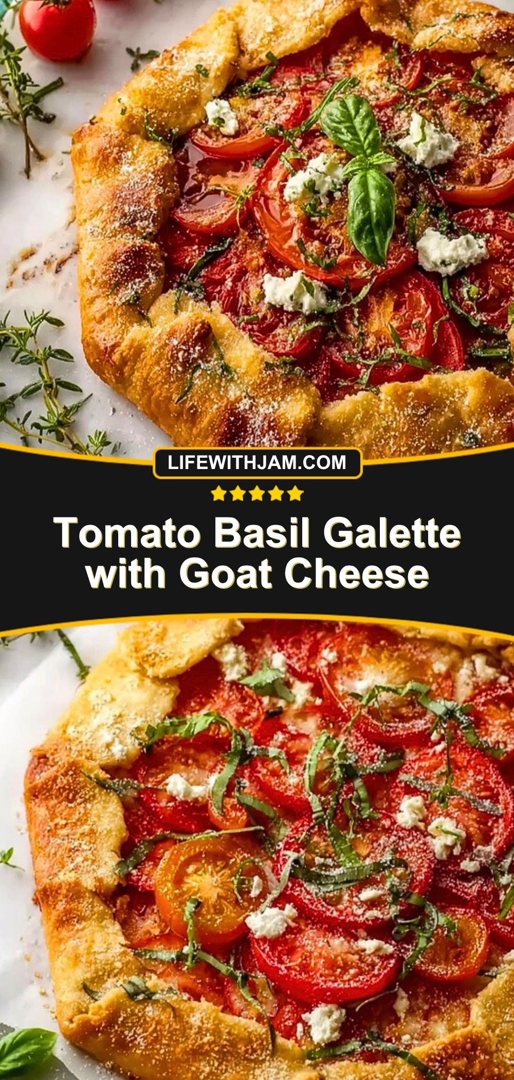 A rustic galette layered with vibrant tomatoes, creamy goat cheese, and fragrant basil, all nestled in a flaky puff pastry crust. This savory bake is elegant enough for gatherings, yet simple enough for weeknight cooking.