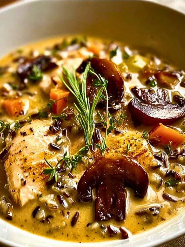 Wild Rice Chicken Soup with Roasted Mushrooms is best served piping hot, preferably with a slice of crusty sourdough or a thick slice of herbed focaccia to soak up the creamy broth. It’s a hearty standalone meal, but if you’re feeling indulgent, a side salad or grilled cheese makes an ideal companion.